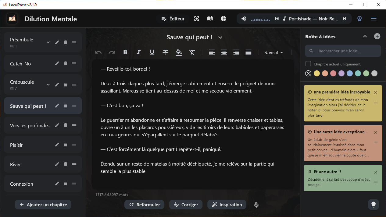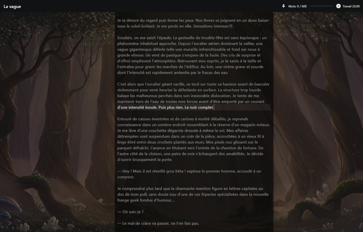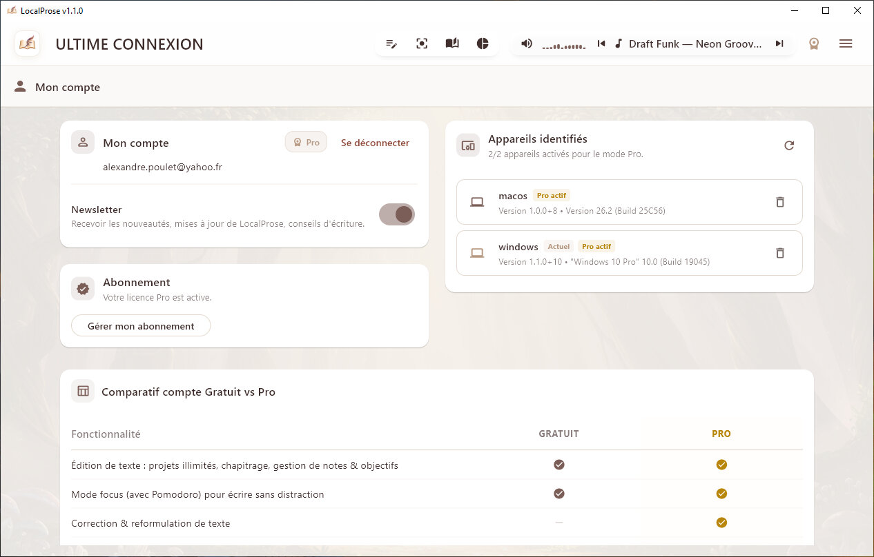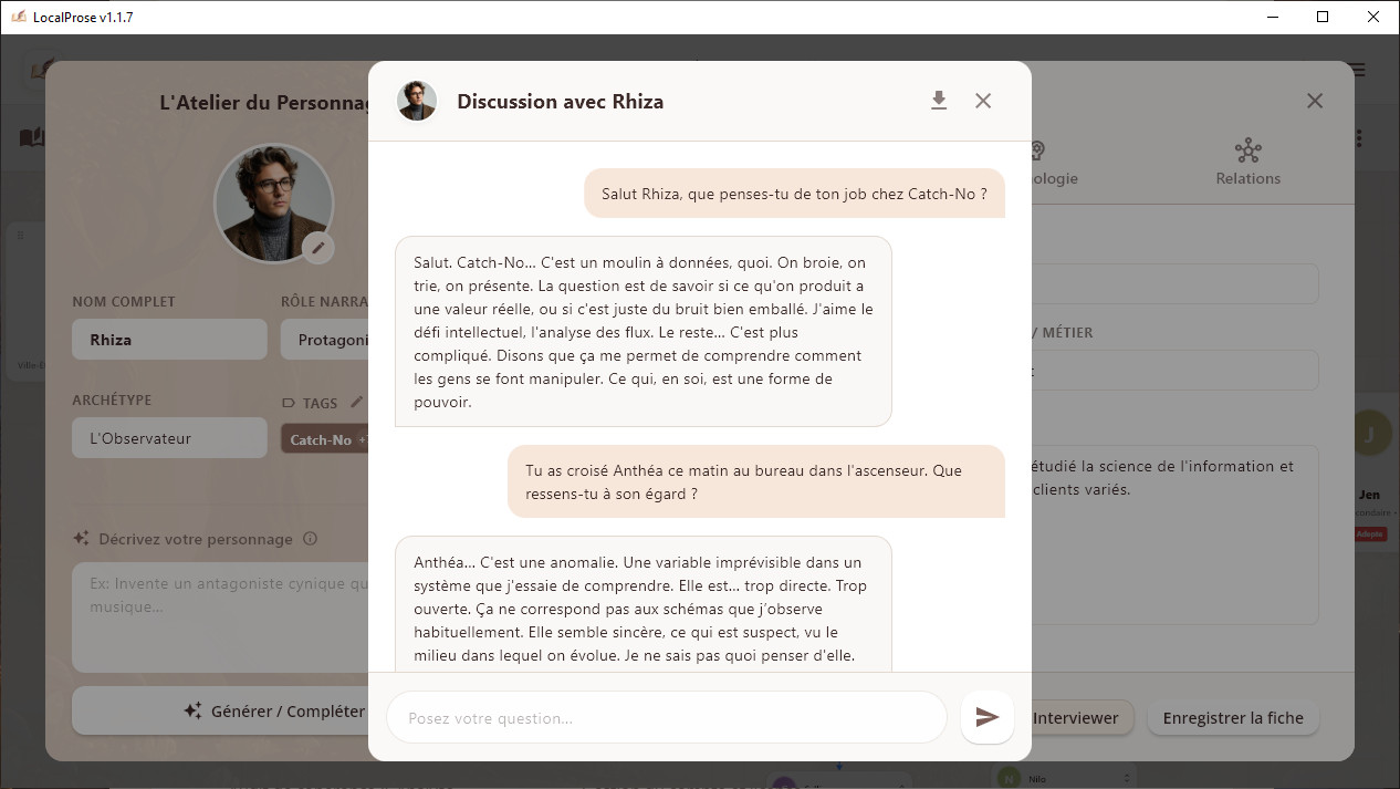 Absolument. Nous proposons une période d'essai de 7 jours à l'activation de l'abonnement Pro. Cela vous permet d'accéder à toutes les fonctions IA gratuitement (correction, reformulation, inspiration, gestion de l'univers, analyse). C'est le meilleur moyen de vérifier que votre ordinateur est assez puissant pour faire tourner l'intelligence locale avant d'investir.