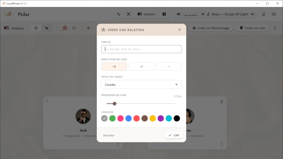 Pour créer un lien, je clique simplement sur mon personnage Jack et je relâche le fil sur Lena. La boîte de dialogue "Créer une relation" s'ouvre. C'est là que je peux qualifier précisément ce lien :
